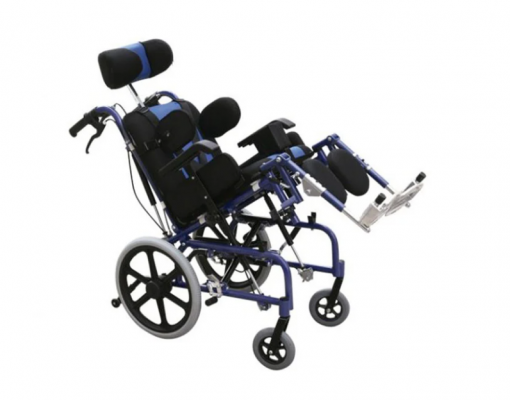 Silla especial para adultos con parálisis cerebral. Reclinable con descansapies de aluminio.